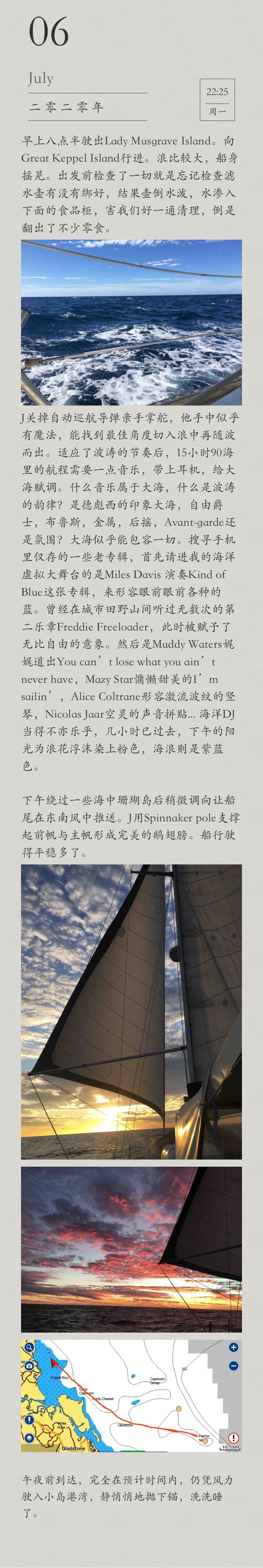 J turned off the auto pilot and took the helm by himself. He seemed to have magic in his hand and could find the best angle to cut into the waves and then smooth out. After adapting to the rhythm of the waves, the 15-hour 90-nautical-mile voyage requires a bit of music, put on my headphones, tried to give the sea a tune. What music belongs to the sea and what is the rhythm of the waves? Was it Debussy’s impression of the sea, Blues, Jazz, Post-rock, Avant-garde or ambient…? The sea seems to be inclusive. Searching among old albums saved in my mobile phone, the first performer I invited into my virtual ocean stage was Miles Davis playing the album Kind of Blue, he truly described the various blues in front of me. I have heard Freddie Freeloader countless times. At this time, I was given the image of incomparable freedom… Then Muddy Waters told ‘You can’t lose what you ain’t never have’ Mazy Star’s lazy and sweet I’m sailin’, Alice Coltrane described the torrents with her harp, Nicolas Jaar’s ethereal sound collage… I was enjoying being an ocean DJ, hours passed. The afternoon sunlight dyed the foam pink, while waves were purple and blue.
