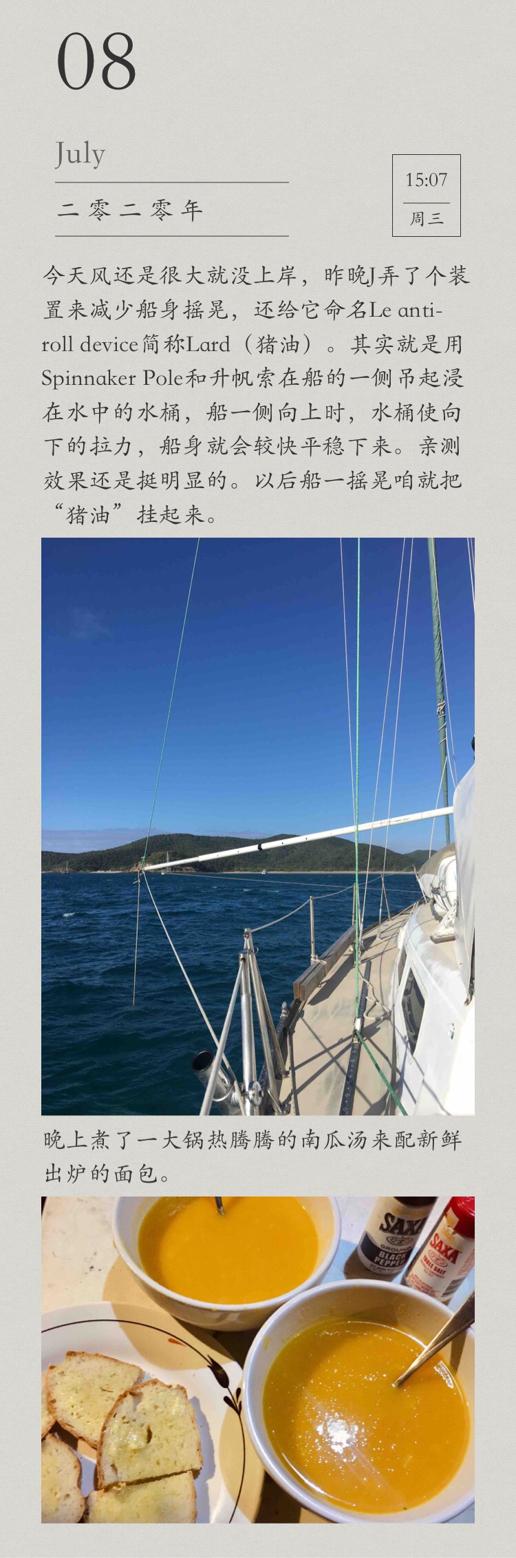 Today, the wind was still very strong so we did not go ashore. Last night, J made a device to reduce the rolling of the boat, and named it ‘Le anti-roll device’ or ‘LARD’. It is simply using the Spinnaker Pole and the halyard to lift the submerged bucket on the side of the boat. When the side of the boat is rolling upward, the bucket pulls downward and the hull will stabilize quickly. It is quite effectIve. If the boat is is rolling next time, we will say ‘hang up the LARD’.
