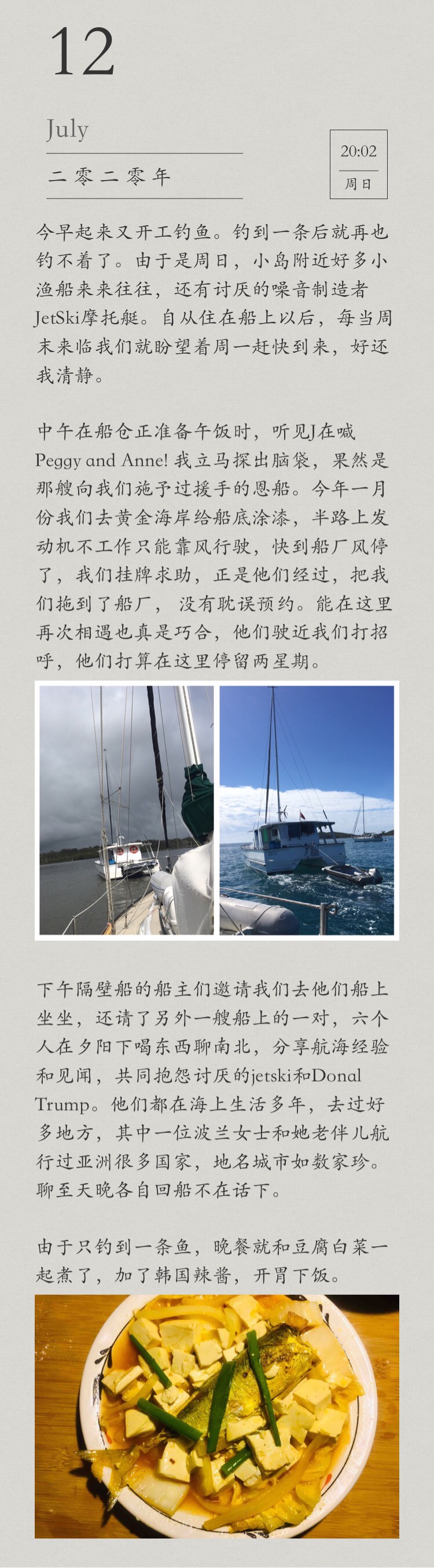 While preparing for lunch inside, I heard J yelled ‘Peggy and Anne!’ I immediately came up to have a look and it was indeed the boat that gave us a helping hand before. On 28th January this year, we went to the Gold Coast to do antifoul, the engine was stopped working halfway, we could only sail by wind. When we are close to shipyard, wind stopped completely, we put out a sign asking for help. It was that boat who went pass and gave us a tow to shipyard, so we didn’t miss the appointment. It was a small world that they met again here. They approached us and said hello. They planned to stay here for two weeks.