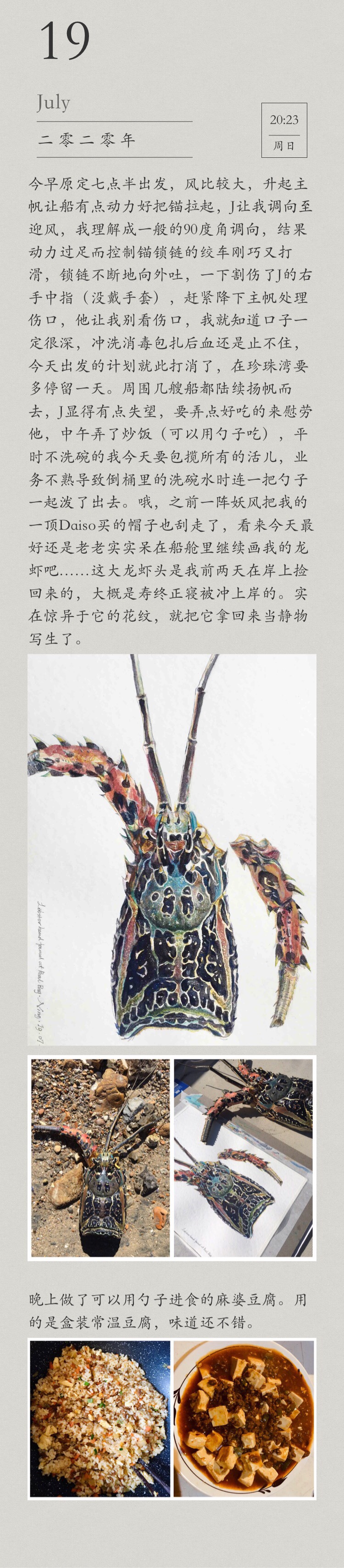 A few boats around us were sailing away one after another. J looked a little disappointed. So I decided to make something delicious to comfort him. I made fried rice for lunch (so he can eat with a spoon). I don’t usually wash the dishes and I had to take care of it today, the result is pouring out a nice spoon with a bucket of dishwashing water. Oh, before that, a gust of wind blew away my Daiso hat. It seems that today I’d better to stay in the cabin and continue painting lobster…