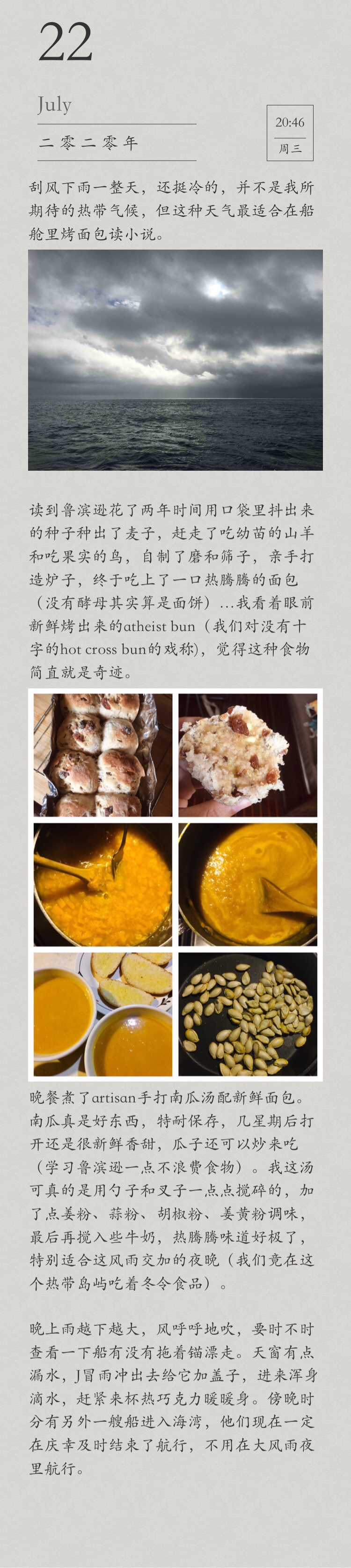 For dinner, I made artisan pumpkin soup to go with freshly baked bread made by J. Pumpkins are really good food to keep on boat, they last very long. They are still fresh and sweet when opened after a few weeks. The seeds can be pan fried and make snacks (learn from Robinson who does not waste food at all). The pumpkin in soup was crushed with spoon and fork by hand. I add some ginger powder, garlic powder, pepper, turmeric powder to taste, and finally folded in some milk. It tastes great when it is hot, especially suitable for this windy and rainy night (we were actually eating winter food on this tropical island).