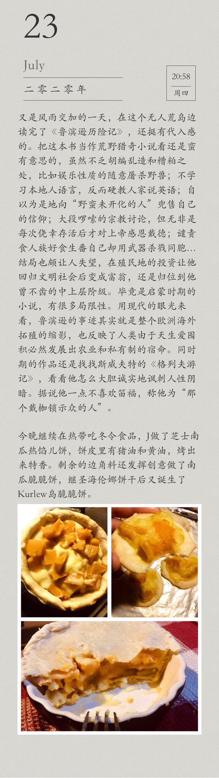 It was another stormy day. I finished reading ‘Robinson Crusoe’ by this little deserted island. It is very interesting to read this book as a novel of wilderness survival, although it is full of fables and incorrectness, such as hunting beasts just for fun; instead of learning the local language, he insisted teaching ‘Friday’ to speak English; being very self-righteous to sell his belief to ‘barbaric and uncivilized people’; long-winded religious discussions, but it is nothing more than being grateful to God just after every survival from disasters; condemning the cannibals but he himself was killing other people with weapons… The ending is also quite disappointing, his investment in the colony allowed him to become a rich man after returning to civilisation, so he was back to upper-middle class which he once despised. After all, it is a novel of the Enlightenment period with many limitations. From a modern point of view, Robinson’s story is actually the epitome of the Europe colonization to overseas, and it also reflects the destiny of human beings to develop agriculture and privatisation due to their natural hoarding habit. For the works of the same period, I would like to read Swift’s “Gulliver’s Travels” next, to see how he boldly and honestly satirizes the gloom of human nature. It is said that he did not like Defoe at all, even calling him “the man in pillory” instead of his name.