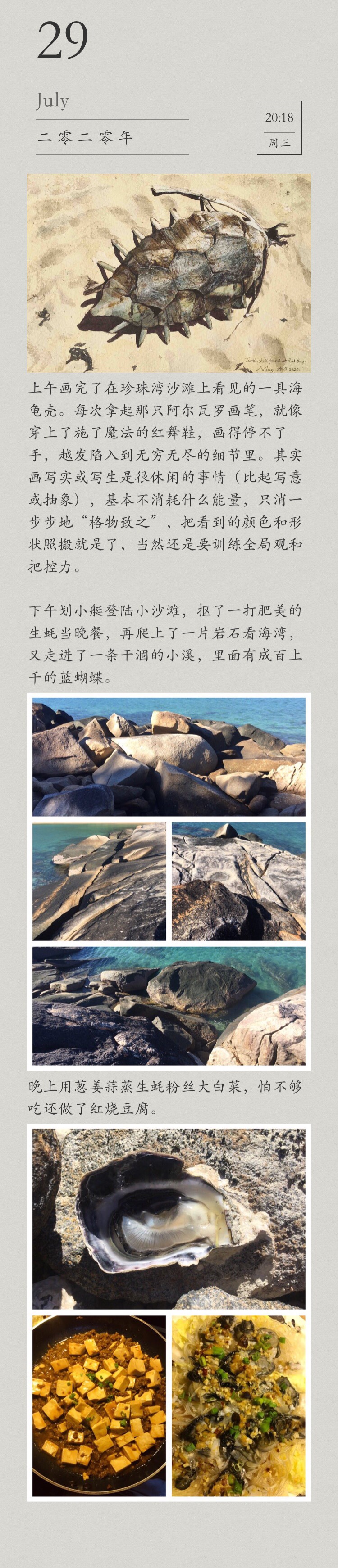 In the morning, I finally finished painting a turtle shell I saw on the beach of Pearl Bay. Every time I picked up that Alvaro paintbrush, it was like putting on the magical red dancing shoes, I couldn’t stop painting, and became more and more plunged into endless details. Actually doing realistic painting or drawing can be very relaxing (compared to imaginative or abstract painting). It basically doesn’t consume much energy. You only need to study the object well and copy the colors and shapes you see. Of course, you still need to train how to take the overall control.