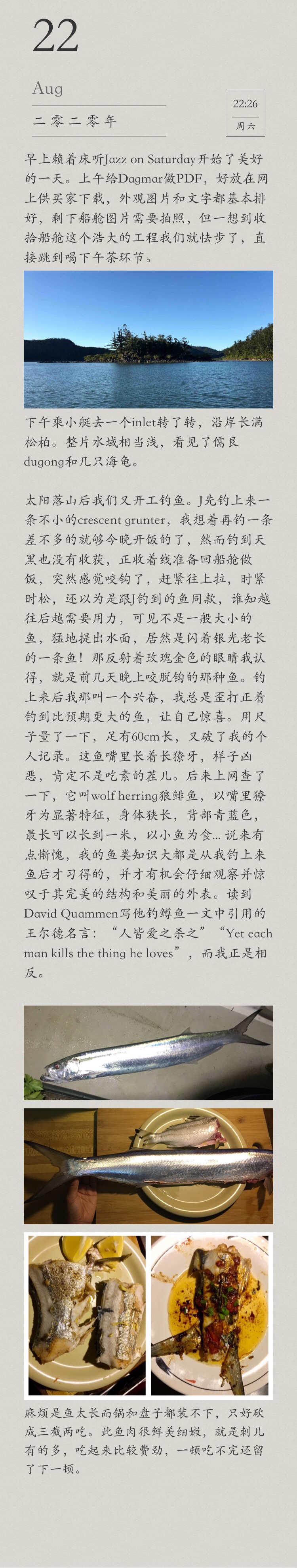 We started fishing again after sunset. J caught a decent size crescent grunter first. I thought I would catch a similar kind for dinner tonight. However, I didn’t catch anything and it’s already dark, I was giving up and pulling the line up. Suddenly I felt something on the hook. Sometimes it felt heavy and sometimes a bit loose, I thought it was another grunter. Yet it got heavier and heavier, I then realised it was not a small fish, the moment it came out of water I saw a very long silver fish! Its eyes were reflecting light of rose gold which I remembered, it was the kind of fish that escaped from my hook the other night. After catching it, I was so excited. I always catch fish bigger than expected to surprise myself. I measured it with a ruler and it was about 60cm long, which broke my personal record. This fish had long fangs in its mouth and looked fierce. It is definitely not a vegetarian. Later, I looked it up on the Internet. It is called wolf herring. Besides its long sharp teeth, It has a long and narrow silver body and a bluish back. It can grow up to one meter long. It feeds on small fish… I am ashamed to say most of my knowledge about certain fish was gained after I caught them, then I had the opportunity to observe them carefully and admire its perfect structure and beautiful appearance. Read a quote from Oscar Wilde: “Yet each man kills the thing he loves”, I think I am the other way around: I come to admire the thing I killed.