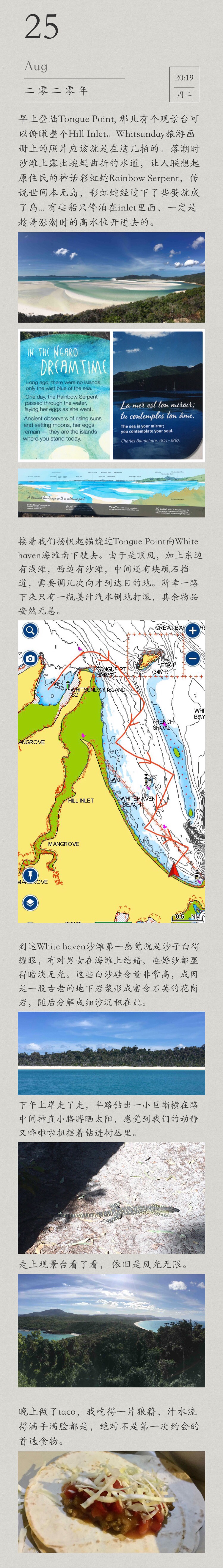 Then we set sails and pulled up anchor to pass Tongue Point and head south to White Haven Beach. We sailed against headwind plus there were shallows to the left and sandy beaches to the right, and some rocks blocking the way in the middle. We had to tack a few times to reach the destination. Luckily we only had one bottle of ginger beer fall down and roll around, and the rest of the items remained there.