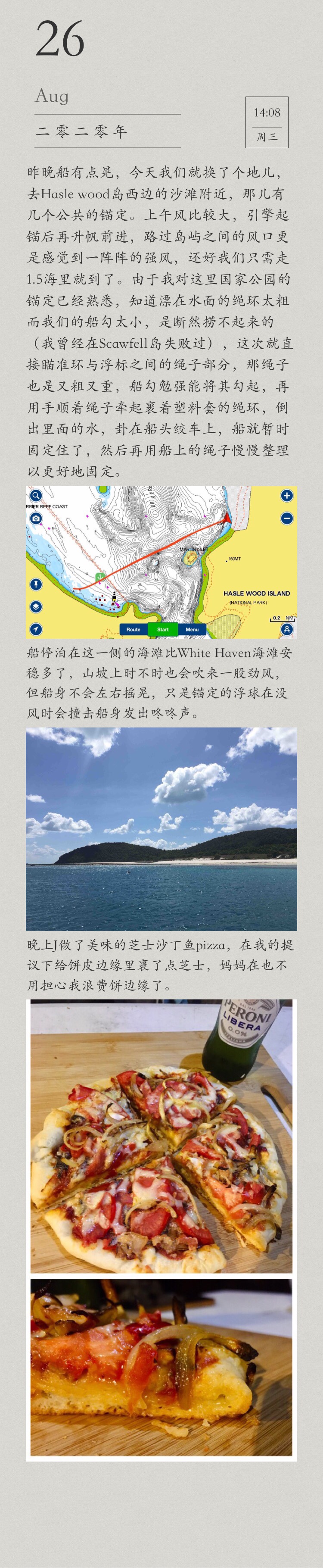 It was a bit rolly last night at Whitehaven beach. Today we moved to the nearby Chalkies beach on the west side of Haselwood Island, where there are several public moorings. Wind was relatively strong in the morning. We were sailing even though it’s only a short distance like 1.5 nautical miles. Wind got stronger while crossing the gap between the two islands. Just before we reaching the mooring, came a strong gust of wind, we immediately head to the wind and dropped main sail. Since I am already familiar with the moorings of the national parks here, I know how thick the loops at the end of the floating ropes are(wrapped with a plastic sleeve). Our boat hook is too small to pick up the loop (I failed at Scawfell Island, and also many other people we watched! ), this time I aimed directly at the rope bit between the loop and the buoy. The rope was thick and heavy too, our boat hook could just hook it up. Then had to pull the rest with hands, and drain water from the plastic sleeve, hang the loop on the bow winch, then the boat would be temporarily moored, only need to fix it up with more ropes.