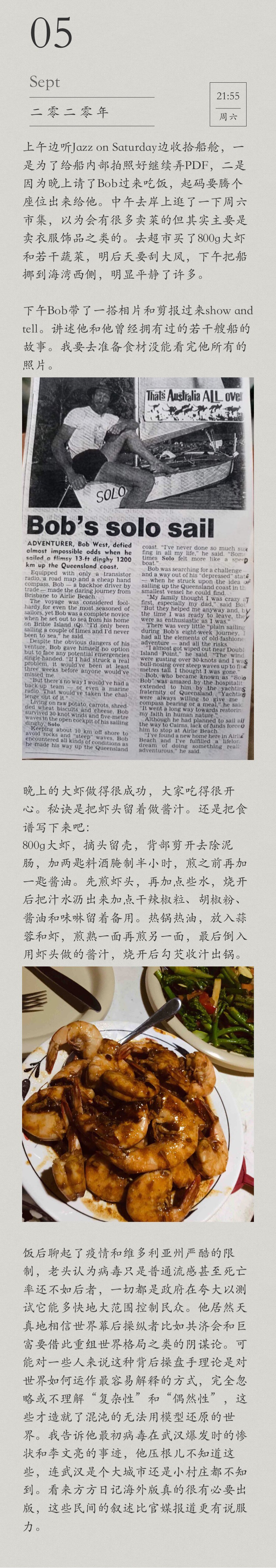 In the afternoon, Bob came and brought some photos and newspaper clippings for show and tell: stories of him and the many boats he once owned. I had to go and prepare dinner so I couldn’t see all his photos.