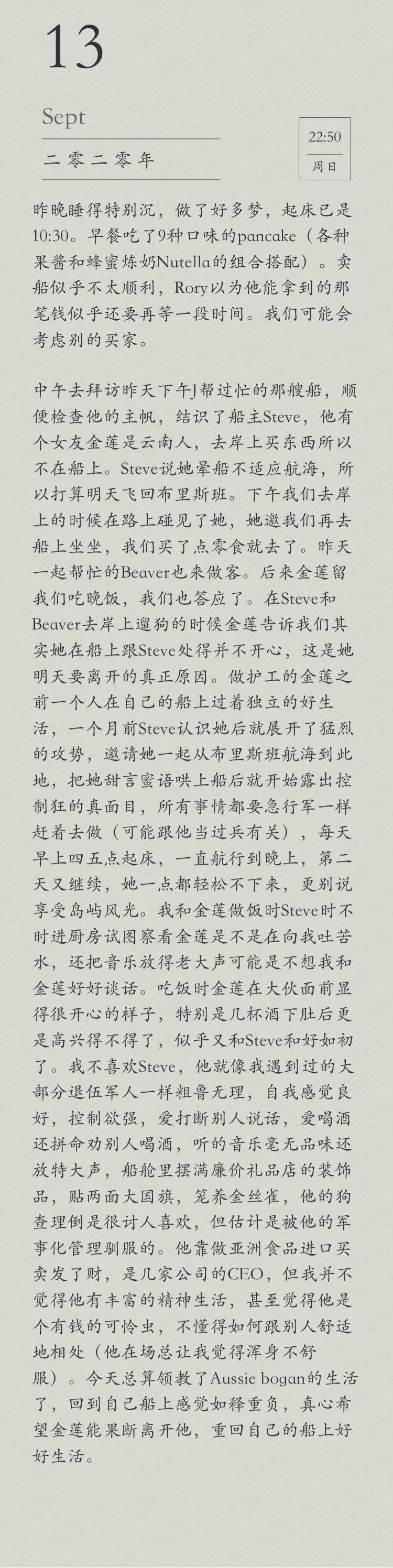 At noon we visited the boat that J had helped with yesterday afternoon, checked out the mainsail and got to know the owner, Steve, who has a girlfriend, Jinlian, who is from Yunnan and was away on shore shopping, Steve said she was seasick and not used to sailing so was flying back to Brisbane tomorrow. Later the day we met her on shore and she invited us to visit the boat again. Beaver, who also helped out with Steve yesterday, was there too. Then Jinlian invited us for dinner and we agreed. While Steve and Beaver went to walk the dogs on shore, Jinlian told us that she wasn’t really happy with Steve on the boat and that was the real reason she was leaving tomorrow. Jinlian works as an carer, was living a good independent life on her own boat. Steve met her a month ago and started a fierce chase, also invited her to sail together from Brisbane to here. After sweet-talking her onto the boat, he began to show the true colours as a control freak. He likes things to be done in a hurry like in army marching(He is a veteran). Got up at 5am, sailed the boat till evening, and repeated the next day. Jinlian couldn’t relax at all, let alone enjoy the island scenery. Later after Steve returned he came into the kitchen from time to time while we were cooking, tried to see if Jinlian was complaining to me. He also played crappy music loudly so we couldn’t hear each other and have a good conversation. Anyhow Jinlian looked happy again in front of everyone at dinner, especially after a few glasses of wine. I don’t like Steve at all, he was as rude and irrational as most of the vets I’d met, egotistical, controlling, interrupting, drinking and trying to get others to drink, no taste on music and forced others to listen while he played loudly. His cabin was full of cheap gift shop decorations, hanging two big Australian flags, had a canary in a cage. His dog Charlie is a nice girl, but I guess it was because of his militarization training. He made his fortune trading Asian food and owned several companies, but I don’t think he has a rich mind. He doesn’t know how to get along comfortably with others (his presence always makes me feel uncomfortable). Today I finally got to know what is an Aussie bogan’s life, and I feel relieved to be back on our own boat. I really hope Jinlian can leave him forever and get back on her own boat to continue her good life.