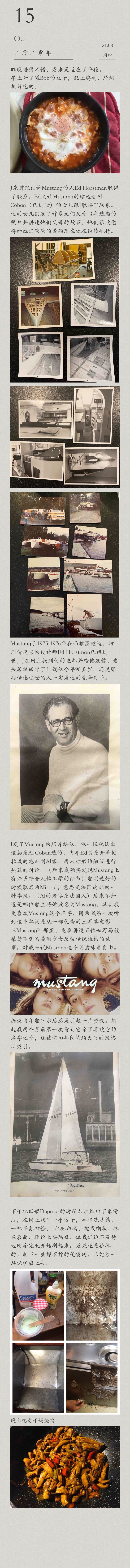 J had been in touch with Ed Horstman, who designed Mustang, and Ed put the daughters of Al Coban (deceased), who built Mustang, in touch with J. His daughters sent some photos of the boat at early stage and told stories about their parents. They were delighted to learn that their father’s beloved boat is still in sailing condition today.