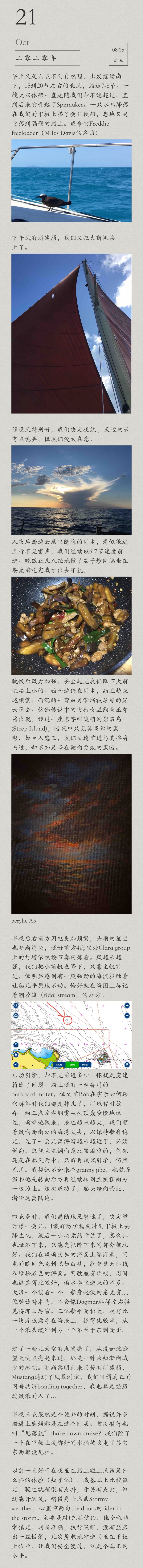 The wind picked up after dinner and we dropped the genoa and changed to jib just to be safe. The lightning was still coming from the southwest, and it was becoming more frequent. The sunken pink moon was gradually covered by thick black clouds. As if a flying witch was about to appear. We passed by a steep rocky island called Steep Island, only its towering shadow was visible in the darkness of the night, like a giant devil. We passed it quickly, not knowing if we were sailing into a deeper darkness…